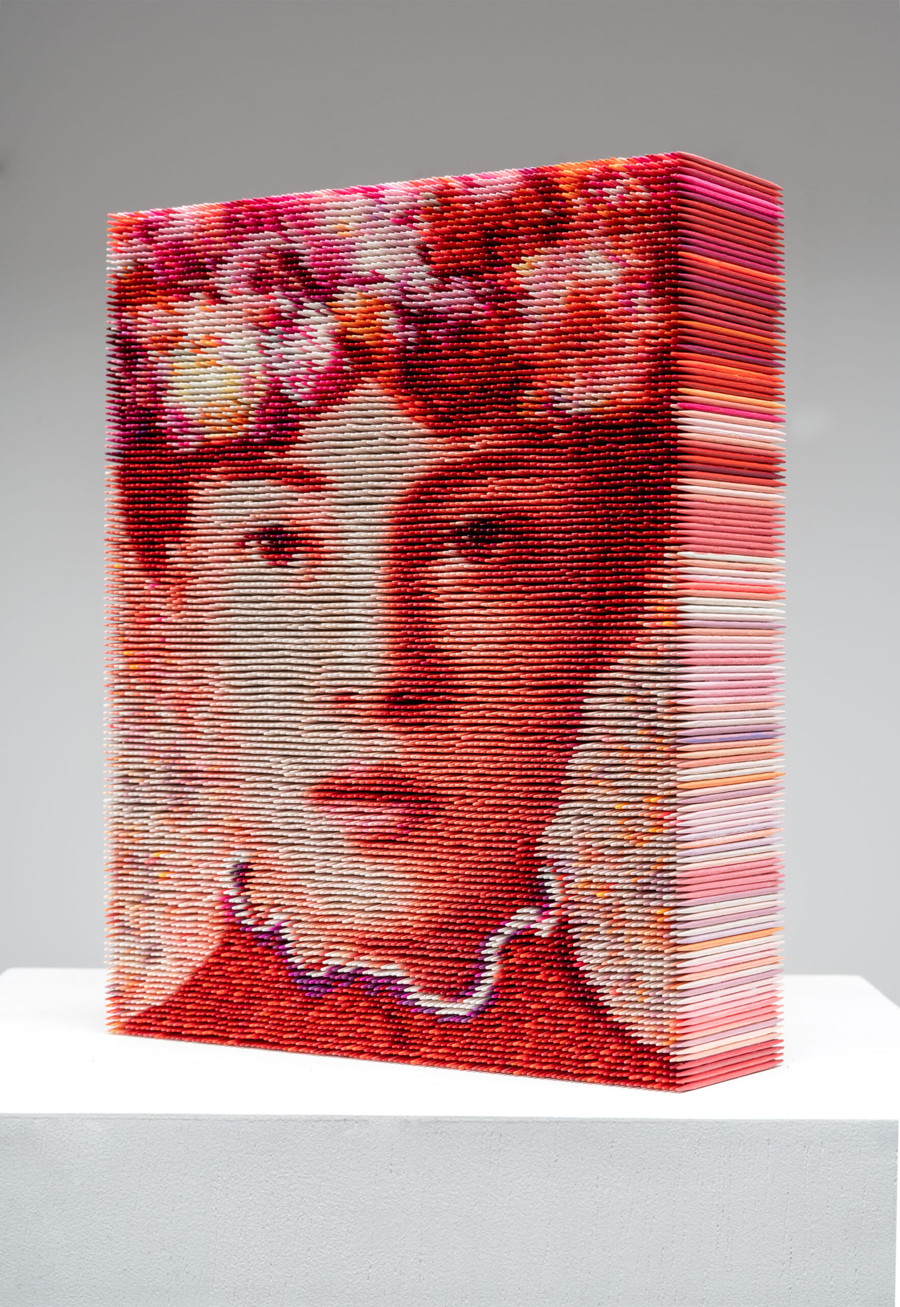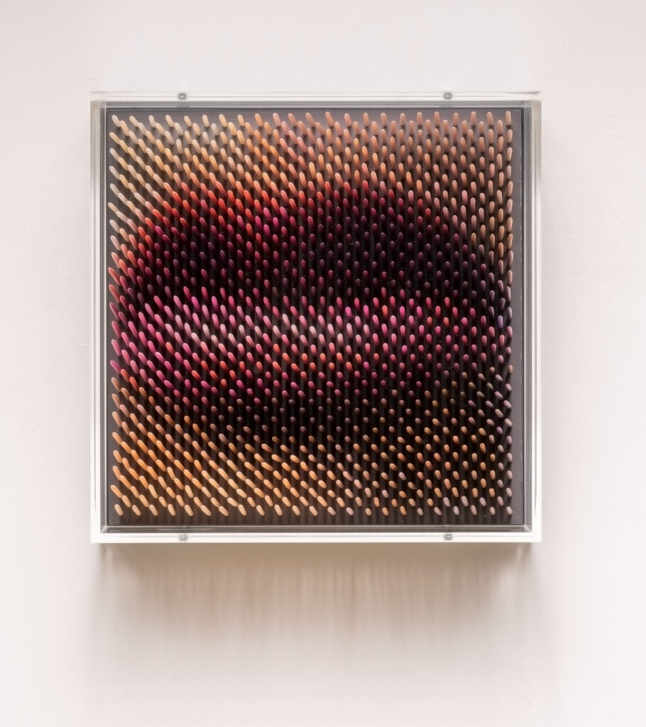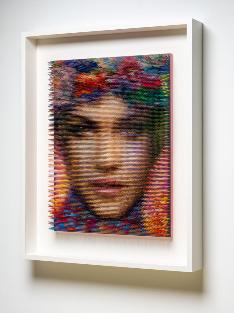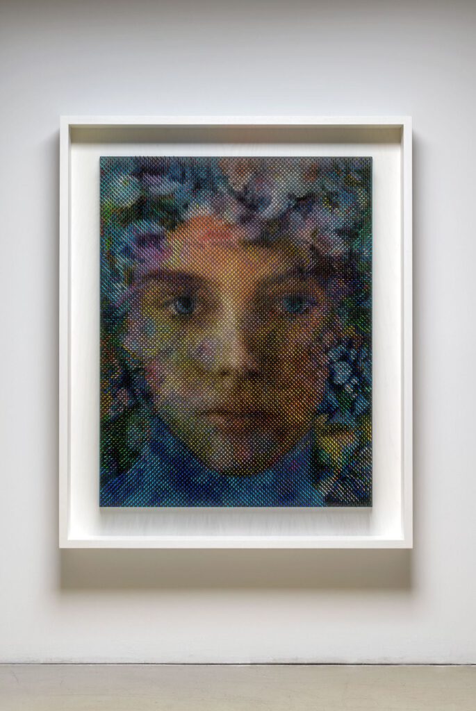 Wakultschik is particularly renowned for his three-dimensional portraits composed of thousands of colored pencil tips. The path to this technique was a process of reduction: from early depictions of saints and collages to the singular point. “That’s where the real play with light began,” he explains. His portraits appear at once human and otherworldly, androgynous and almost angelic; they do not tell specific stories, but open up emotional spaces.