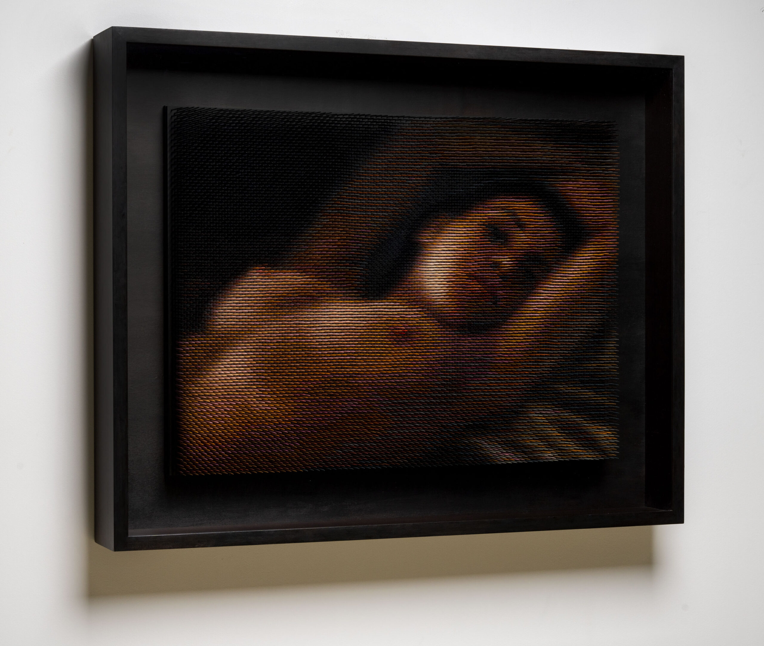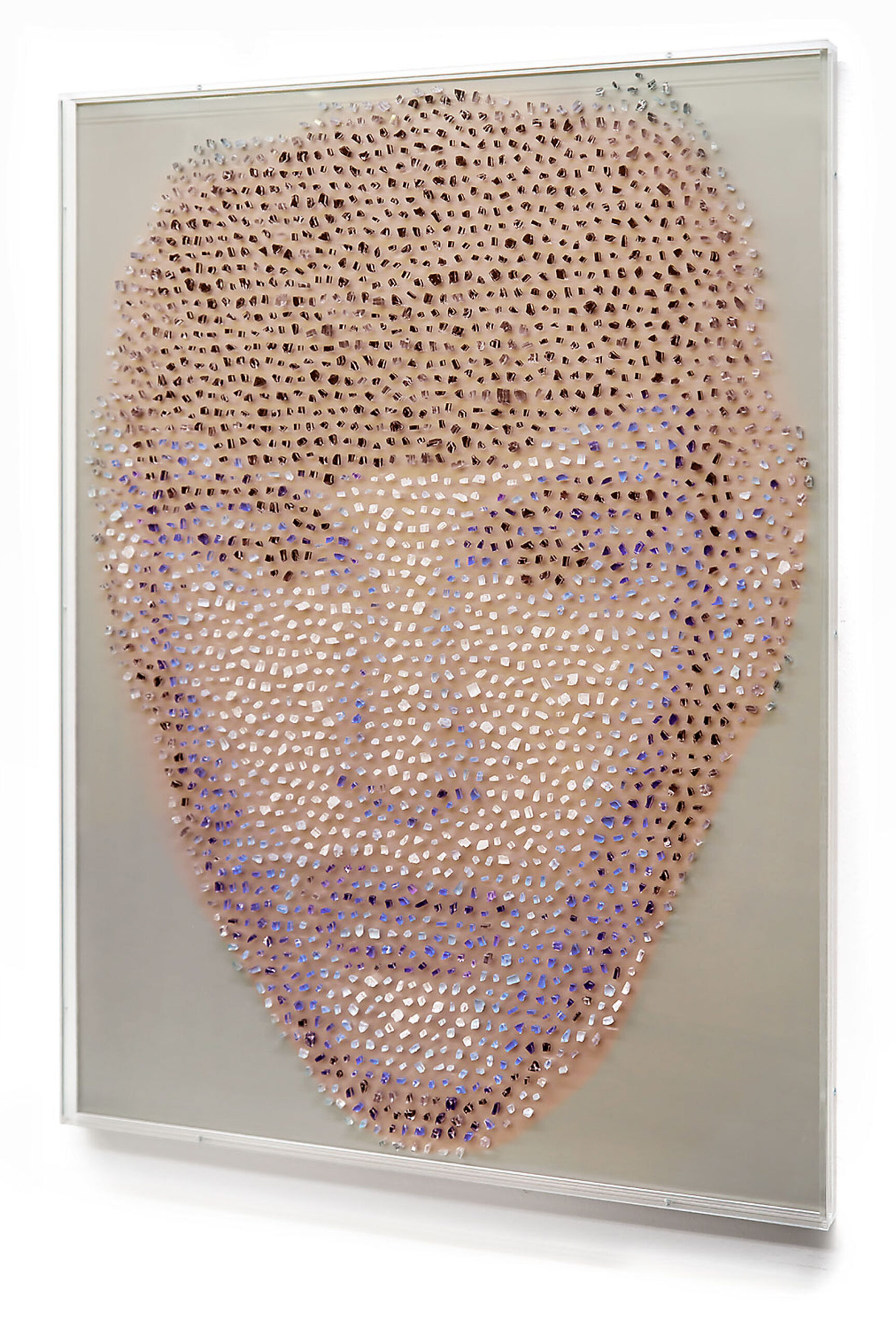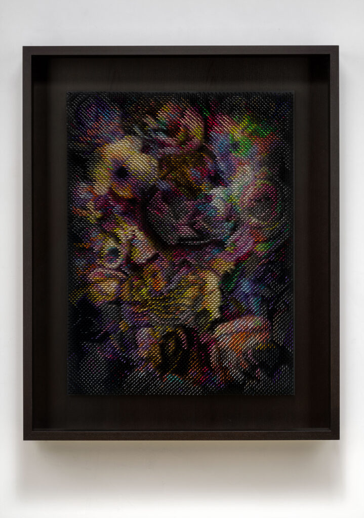 Wakultschik is particularly renowned for his three-dimensional portraits composed of thousands of colored pencil tips. The path to this technique was a process of reduction: from early depictions of saints and collages to the singular point. “That’s where the real play with light began,” he explains. His portraits appear at once human and otherworldly, androgynous and almost angelic; they do not tell specific stories, but open up emotional spaces.